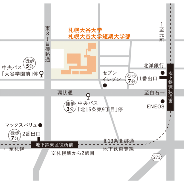 交通アクセス 2025.09.24 〒065-8567 札幌市東区北16条東9丁目1番1号TEL 011-741-3681 FAX 011-741-3853 地下鉄東豊線「東区役所前」駅下車 2・3番出口から徒歩7分東豊線「環状通東」駅下車 1番出口から徒歩7分 中央バス東17 北光線「大谷学園前」下車 徒歩5分東19 北光・北口線「大谷学園前」下車 徒歩5分「北15条東9丁目」下車 徒歩3分